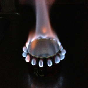 燃料用アルコールを入れ着火します。最初は中央部分からしか炎が出ませんがストーブが温まってくると周りの穴からポッポッと火がついていきます。